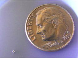 Figure 1: Size comparison of mercury found in a typical CFL bulb sold in the U.S. (Photo courtesy of Monte Helm, Ph.D. Fort Lewis College)