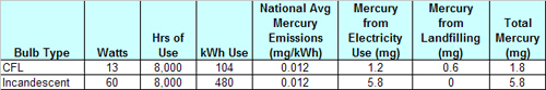 With proper use, CFL bulbs can greatly reduce both household energy consumption for lighting and environmental mercury release. The table below details both the kWh in savings provided by the utilization of a CFL versus a standard incandescent light bulb and the reduction in environmental mercury emissions resulting from reduced electricity generation at power plants