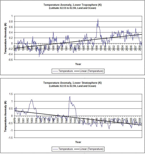 - The upper atmosphere has cooled while the lower atmosphere has warmed (Source: UAH)