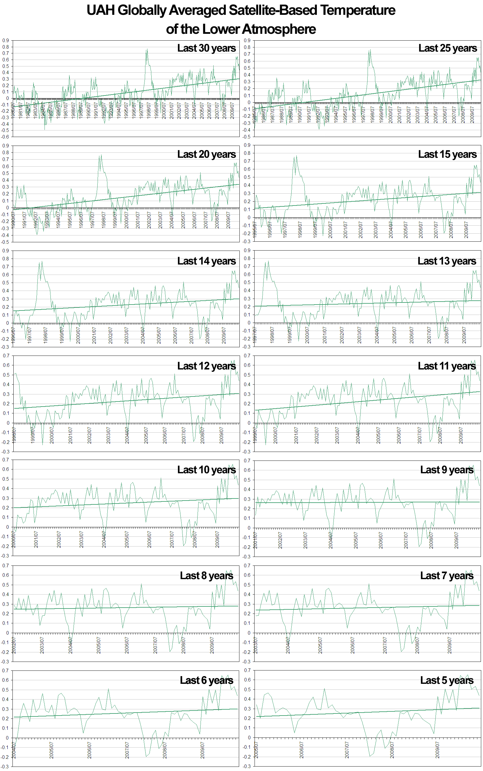 Of course, arbitrarily selecting a starting point for a temperature trend has always been a specious argument. Year-to-year variation in temperatures is more a factor of weather resulting from variability in short term conditions, noise within the longer term climate signal. Climate is about trends over longer periods. The National Climatic Data Center (NCDC) utilizes a standard 30-year-period to define a “climatological normal”. And, as you can see from the satellite temperature records below from the University of Alabama, Huntsville, the 30-year signal is unmistakable.