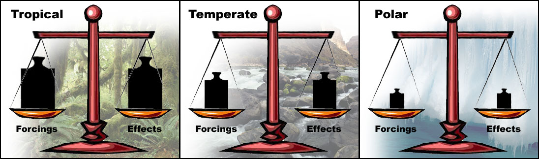 The combined magnitude, speed, and frequency of the forcings on the system at any given time dictates how balanced or unbalanced the system is and under what predominant climate conditions a balance can be found.