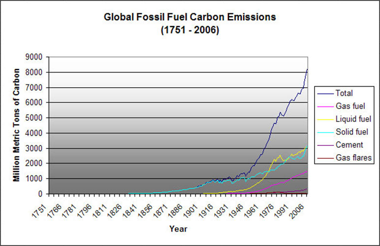 “Since 1751 approximately 329 billion tons of carbon have been released to the atmosphere from the consumption of fossil fuels and cement production. Half of these emissions have occurred since the mid 1970s.”